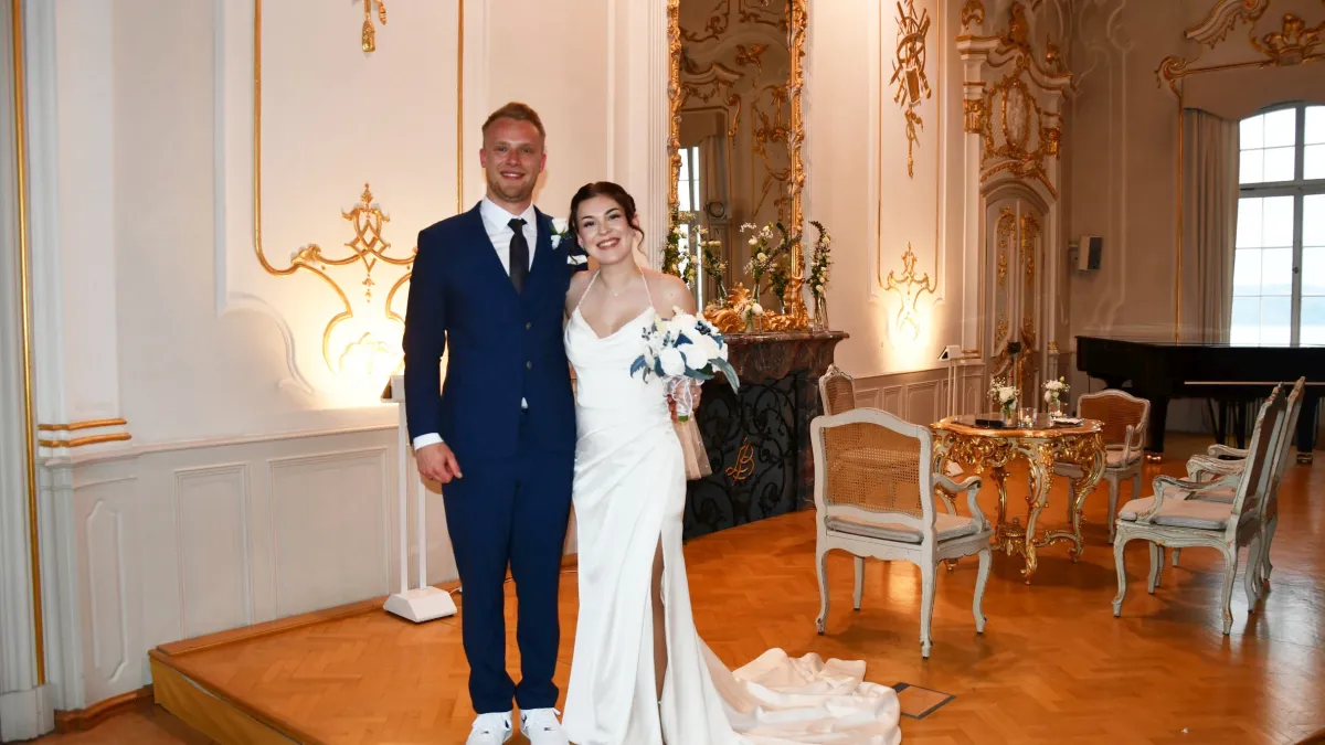 Brautpaar steht vor einem Kamin in einem prunkvollen, barock dekorierten Raum auf der Insel Mainau; die Frau trägt ein weißes Brautkleid mit Blumenstrauß, der Mann einen blauen Anzug. Im Hintergrund sind vergoldete Verzierungen, ein Spiegel, Möbel und ein Flügel zu sehen.
