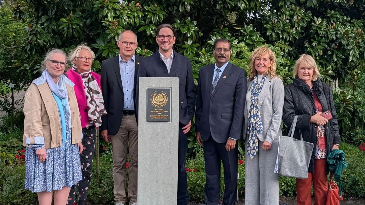 Zwischen farbenfrohen Rosenblüten zeugt neuerdings eine Stele mit gravierter Schiefertafel von der besonderen Anerkennung, die dem Italienischen Rosengarten der Mainau kürzlich zuteilwurde: Mit dem „Award of Garden Excellence“ zeichnete die Weltrosengesellschaft die Blumeninsel als Ort herausragender Gartenkultur und botanischer Kompetenz aus. Enthüllt wurde der Preis am letzten Samstag von Mainau-Geschäftsführer Björn Graf Bernadotte gemeinsam mit Sushil Prakash, dem Präsidenten der WFRS. In seiner Ansprache betonte Prakash die hohe gestalterische Qualität des Italienischen Rosengartens und beschrieb ihn als einen Ort, der insbesondere in bewegten Zeiten zur Ruhe und Erholung einlädt. „Der ‘Award of Garden Excellence‘ ist eine große Ehre für die Insel Mainau und eine wunderbare Anerkennung für das Engagement unsere Gärtnerinnen und Gärtner. Der Italienische Rosengarten ist nicht nur Ausdruck der lebendigen Historie der Mainau – er geht auf Großherzog Friedrich I. von Baden zurück –, sondern verkörpert auch unsere Leidenschaft für die Rose sowie unser Bestreben, botanische Vielfalt für alle Generationen erlebbar zu machen“, so Gartendirektor Markus Zeiler bei der Enthüllung der Stele.