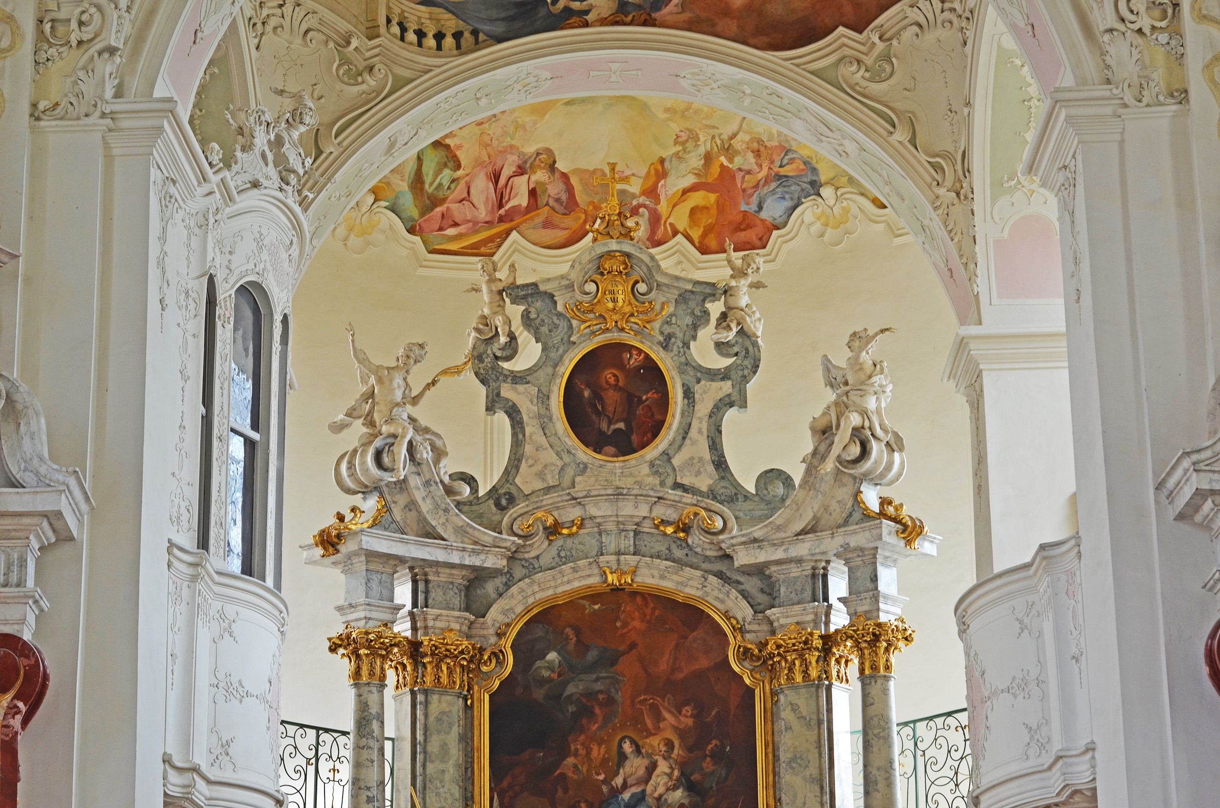 Franz Joseph Spiegler malte Deckengemälde und Hochaltarbild, die dem Leben Mariens gewidmet sind. Der reichhaltige Stuck von Francesco Pozzi ist mehr als nur Dekoration, er lenkt den Blick auf das Wesentliche: den "himmlischen Bereich" des Chorraums und des Hochaltars. Die Kirche ist ein Gesamtkunstwerk, das die Religiosität seiner Zeit widerspiegelt.